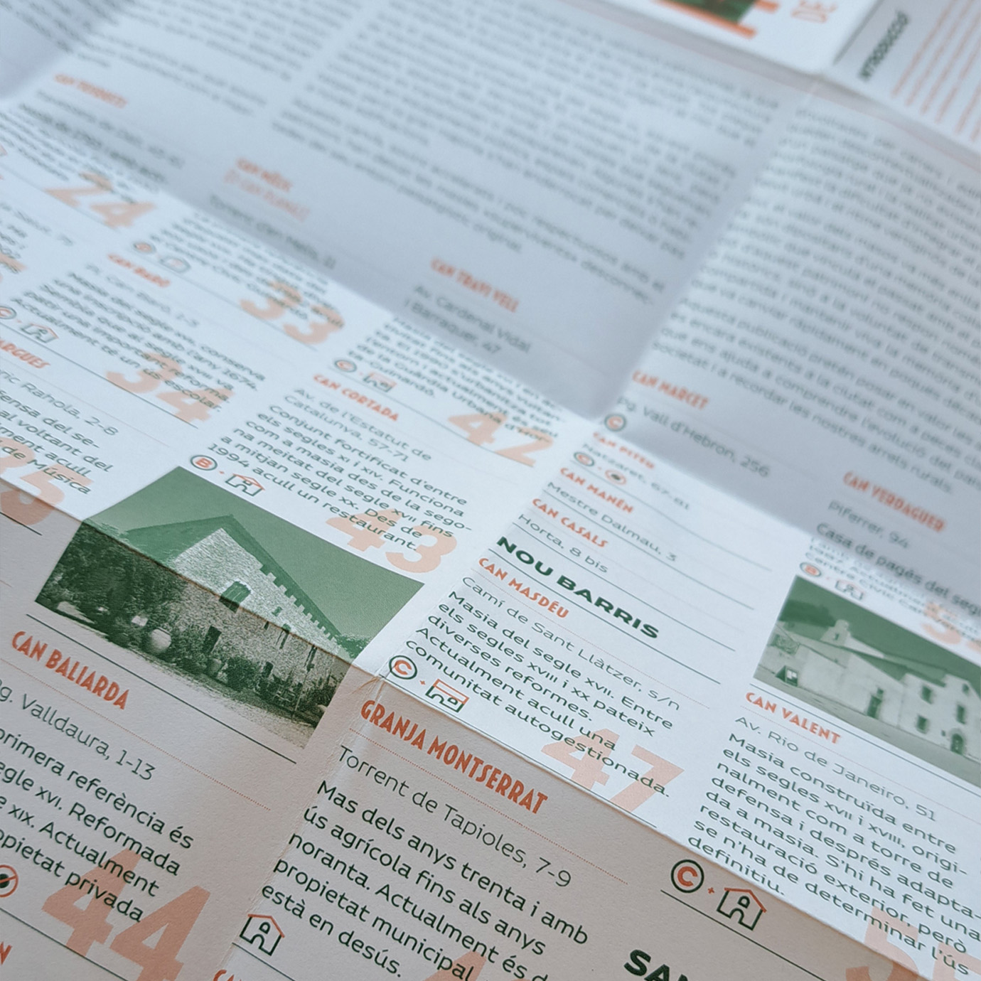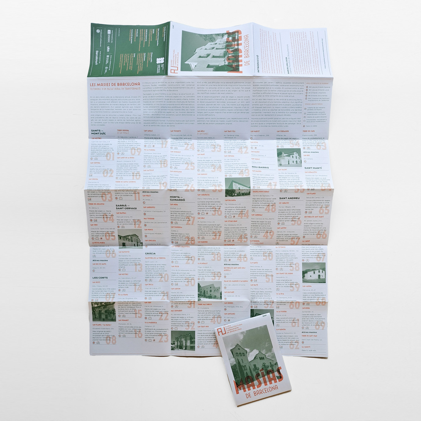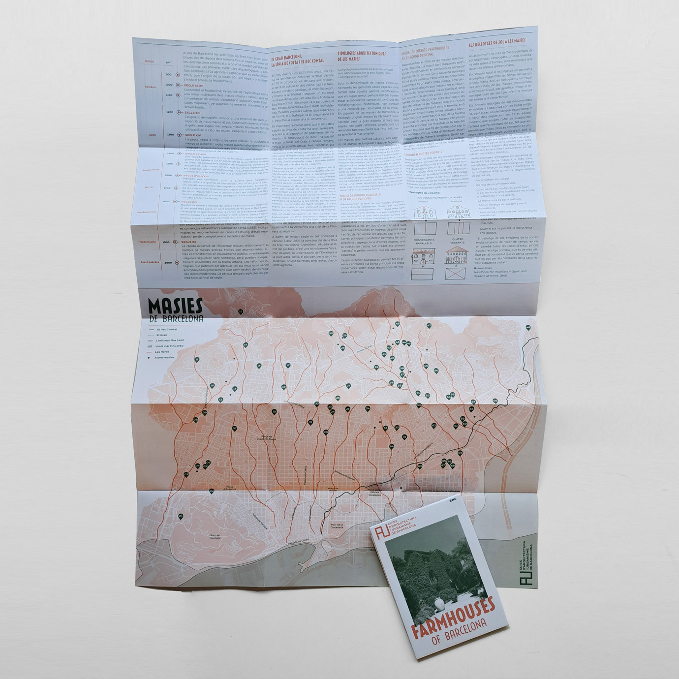 El plànol-guia descriu 69 de les masies més ben conservades, en referencia 20 més i, a través de diversos texts, explica l’evolució de les masies al Pla de Barcelona i descriu les diferents tipologies més habituals.